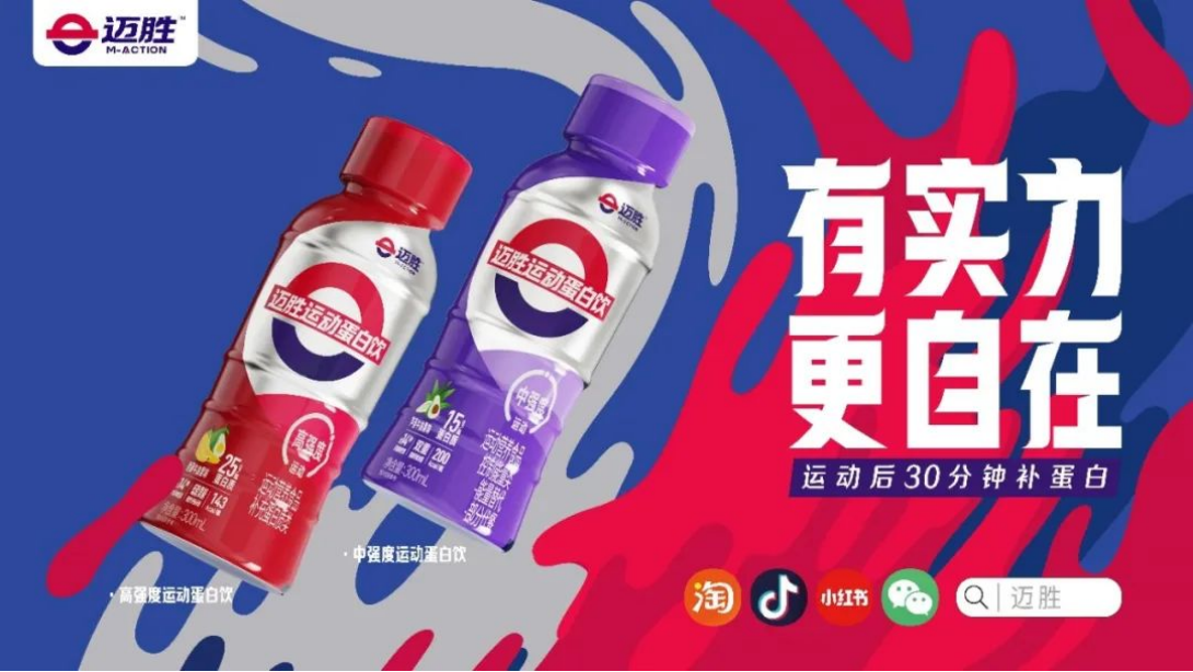 蒙牛推出的迈胜运动蛋白饮,瞄准运动后30分钟黄金时间的蛋白质补充,有中强度(15g蛋白)和高强度(25g蛋白)两款,中强度款采用双重膳食纤维配方,高强度款则加入了高含量的乳源钙和益生元,带来更多健康益处。此外,产品均添加了14种维矿物质,采用低糖、低脂、低乳糖的配方,减轻饮用负担;采用RTD的产品形态,让营养补充更方便快捷。