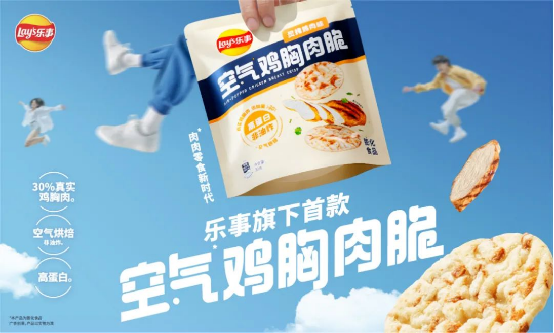 加码高蛋白零食赛道,乐事曾推出其首款高蛋白肉脆零食-空气鸡胸肉脆,选用鸡胸肉作为原材料,肉脆中含有30%真实鸡胸肉,并通过空气烘焙黑科技,看见真实肉粒,轻盈薄脆。乐事通过原材料与制作工艺的健康化,为现代消费者带来了一款随时可吃的高蛋白肉脆零食。