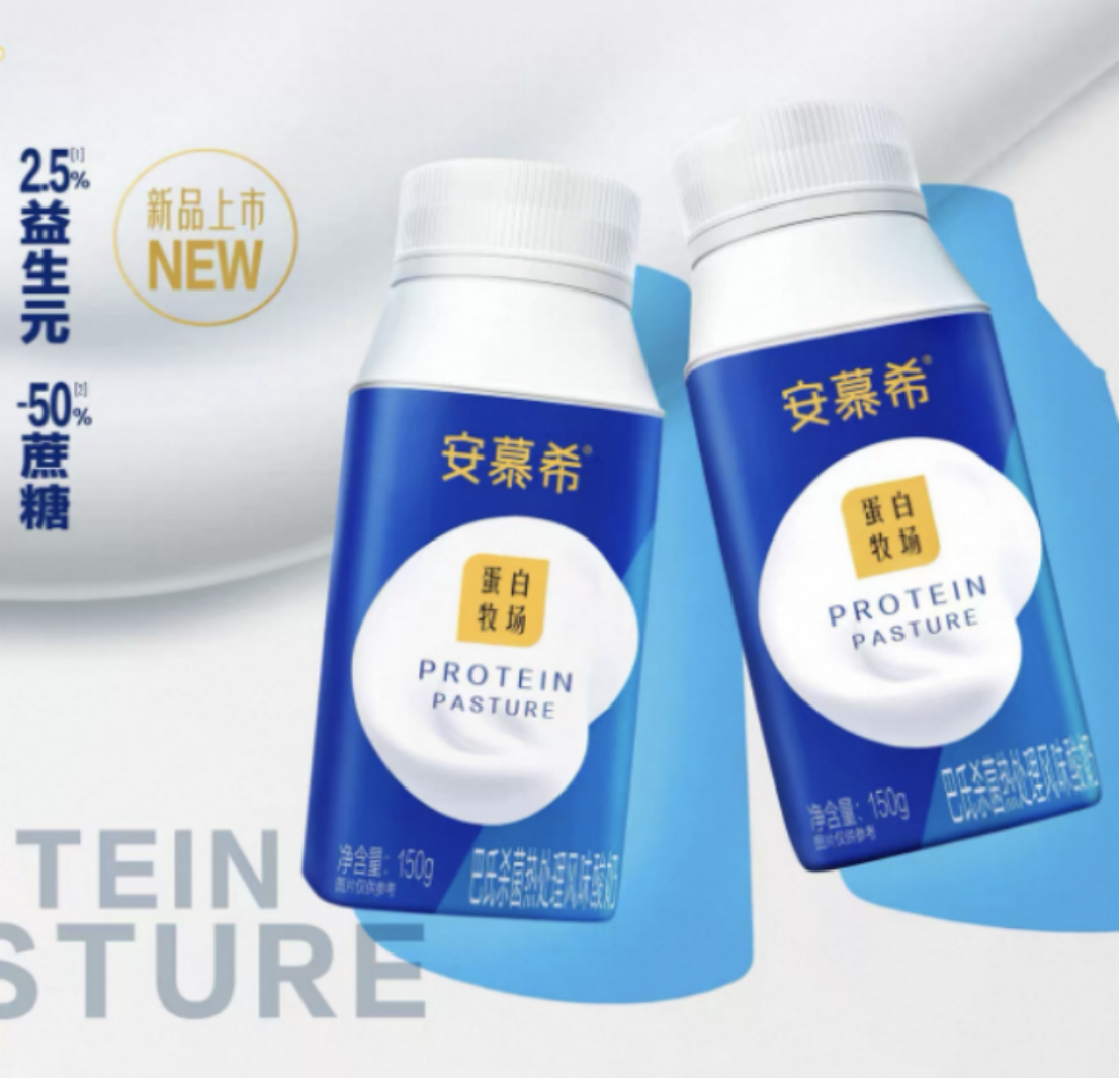 安慕希推出的蛋白酸奶,添加乳清蛋白粉,一杯蛋白质含量为5.4g。同时还添加2.5%的益生元低聚半乳糖,而蔗糖添加量仅为4%,相比于PET安慕希希腊风味酸奶原味蔗糖的添加量(8.5%)减少了50%以上,适合有控糖和减脂需求的人群。此外,这款新品高钙低脂,每100g含4g脂肪与95mg钙,适合当做运动后的补给产品。