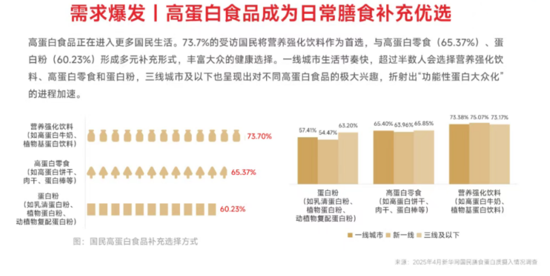 新华网发布的《2025年国民蛋白质摄入现状调查报告》显示,大约98%受访者都认为日常饮食应该“每天一杯优质蛋白”,其中55.65%“完全认同”。多维度分析也显示,“每天一杯优质蛋白,为健康打底成为跨代际的共识:Z世代健身撸铁,银发族防肌肉减少,青少年成长发育,中年为自己也为家人健康打底,蛋白质需求无代沟”。与此同时,高蛋白食品正在进入更多国民生活。73.7%的受访国民将营养强化饮料作为首选,与高蛋白零食(65.37%)、蛋白粉(60.23%)形成多元补充形式,丰富大众的健康选择。