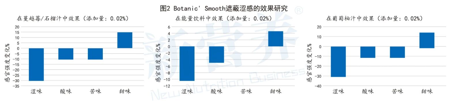 在遮蔽涩感的效果产品试验中,Botanic'Smooth表现优秀,可降低高达30%的涩感,显著改善风味平衡,提升口感。在不同饮料中,Botanic'Smooth的效果各异。研究表明,蔓越莓/石榴汁涩感降低30%,酸味和苦味可降低10%,改善程度十分显著;能量饮料涩感降低10%,甜味增加4%;葡萄柚汁涩感降低30%,酸味和苦味分别降低10%。这些数据充分证明该方案在不同类型饮料中的适用性和有效性。(见图2)