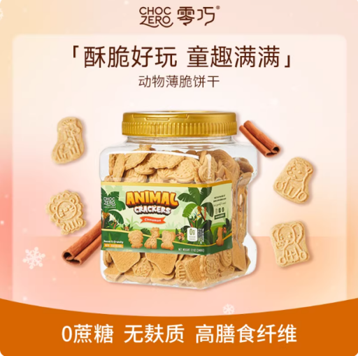 CHOCZERO动物薄脆饼干,是一款适合宝宝的零食饼干。饼干集合了6款动物造型:老虎、犀牛、长颈鹿、斑马、狮子、大象,宝宝在享受味道的同时,也无形中提高了对小动物的认知能力。在配方上,使用巴旦木粉代替面粉,摒弃了精制蔗糖,取而代之的是“纤维甜”罗汉果甜苷+膳食纤维,提升饱腹感的同时,也为健康“保驾护航”。