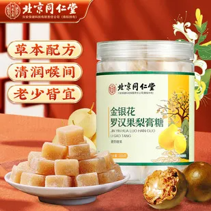 北京同仁堂推出的金银花罗汉果梨膏糖,以百年匠心融合自然精粹。严选金银花、永福罗汉果与新鲜梨汁,经传统熬膏工艺浓缩成琥珀色糖块,每一口都凝聚着草木的温润——金银花的清冽似山涧晨风,罗汉果的甘甜如溪泉漫过舌尖,梨膏的醇厚像暮春细雨,三重滋味交织成清润的味觉诗篇。独立小颗包装便携易存,随时随地可含服,入口先是淡淡草本香,而后清甜渐显,余韵带着梨的温润。
