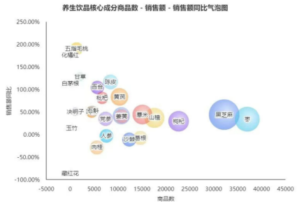 除枸杞、红豆、枇杷等大众熟知的成分外,魔镜分析+ 监测数据显示,主流电商平台养生饮品赛道的药食同源成分中,黑芝麻、红枣两大经典品类稳居销售额头部。黑芝麻养生饮品以冲饮粉为主流,在核桃、燕窝、银耳等成分加持下,持续提升产品附加值;而红枣覆盖茶包、冲饮粉、植物饮料等多种类型,常搭配桂圆、山楂、红糖、玉米须等成分,丰富了饮品的风味层次。