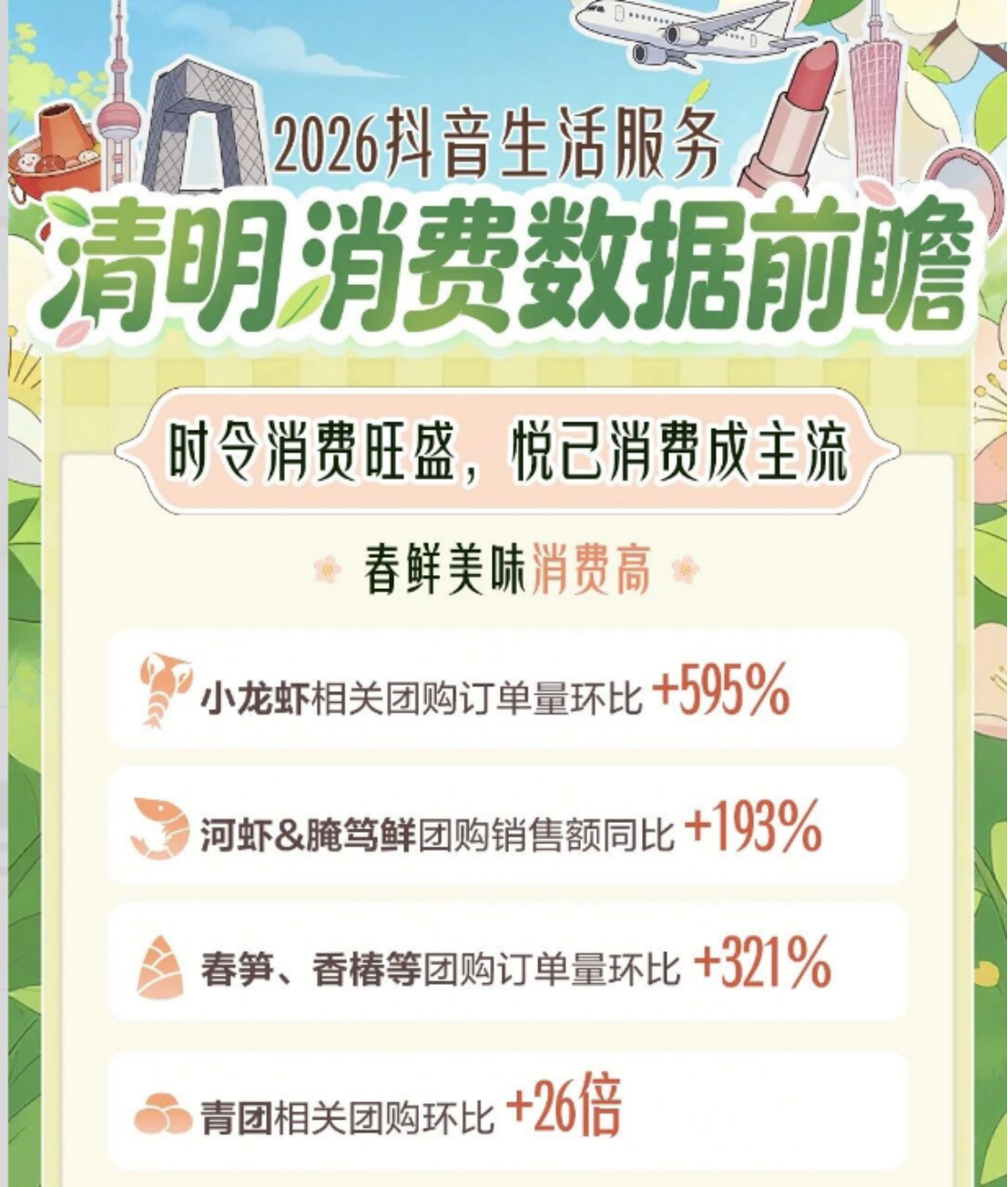 今年春季,青团也不意外地成为了零售赛道的黑马。淘宝闪购数据显示,3月以来青团外卖订单量环比暴涨690%,在生鲜、零食等类目中一骑绝尘。叮咚买菜消费数据显示,清明假期前后,平台传统时令美食青团持续走俏,品类整体销量同比增长超30%。抖音生活服务发布的《2026清明消费数据前瞻》也显示,3月以来春日餐饮消费市场迎来爆发,应季美食消费升温,其中青团团购订单量环比增长26倍。