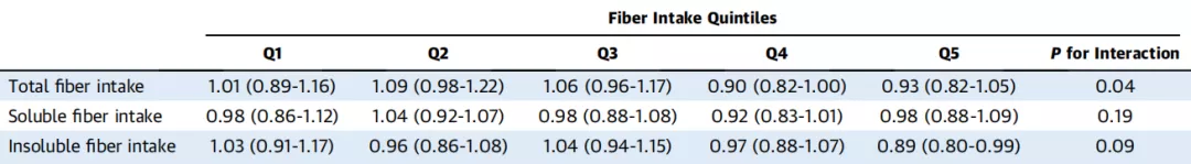 在纤维总摄入量较高的参与者中,总木酚素摄入与冠心病的负相关性更为明显(Pinteraction=0.04),尽管这种关系未达到统计学意义(表1)。