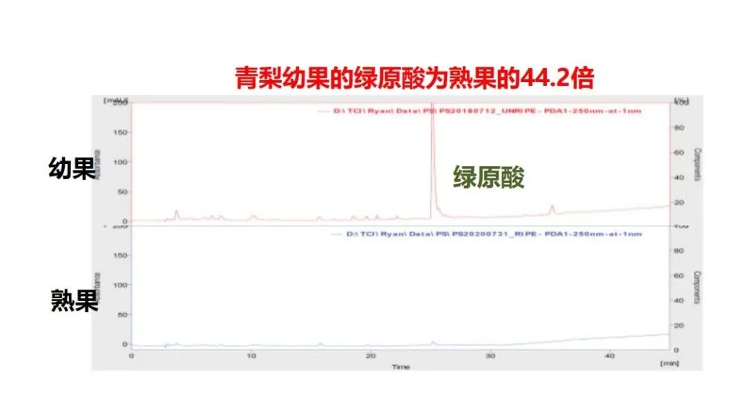 大江生医研发团队从青梨幼果萃取中分析出高含量的Chlorogenic acid绿原酸和Arbutin熊果素,权威文献指出此两种化合物皆具有防止植物受外界刺激,抗氧化抗发炎反应,可抵御外界污染物侵入[1-3],分析结果更揭示出青梨幼果的绿原酸含量更是高达熟果的40倍之多。