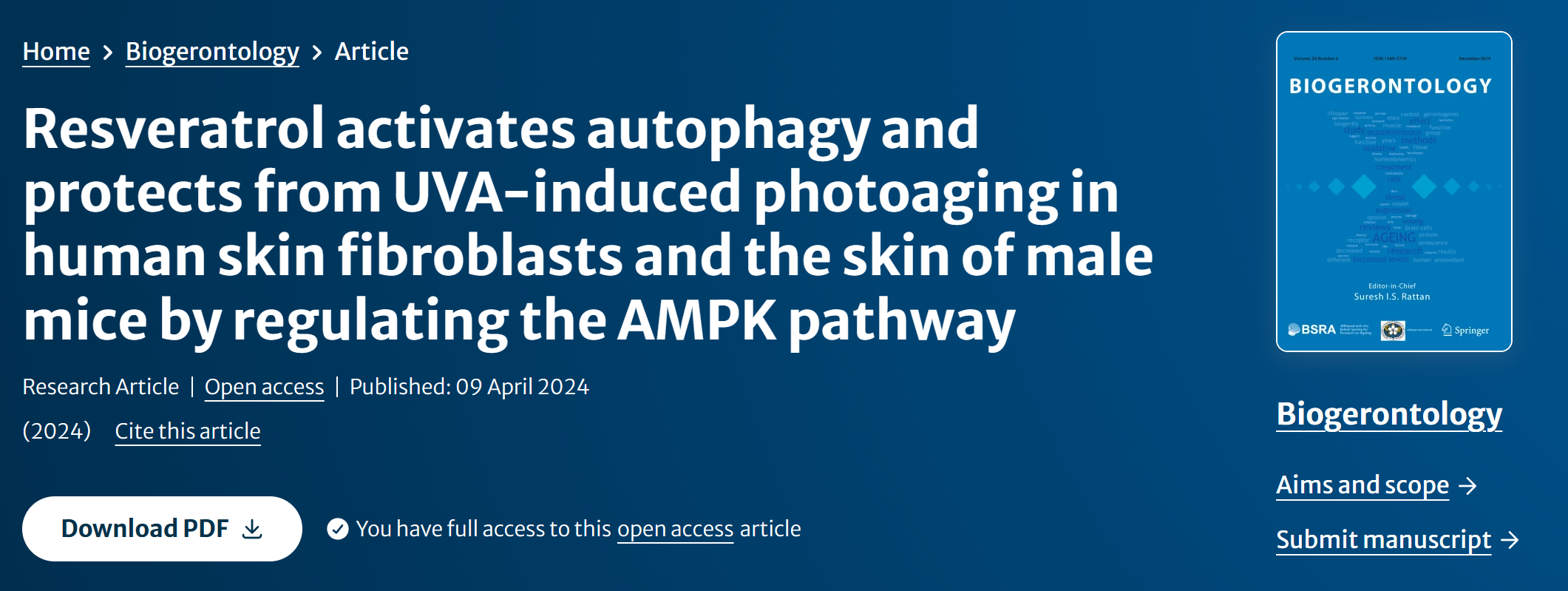 在《Biogerontology》期刊上发表了一篇题为"Resveratrol activates autophagy and protects from UVA-induced photoaging in human skin fibroblasts and the skin of male mice by regulating the AMPK pathway"的研究论文。[2]