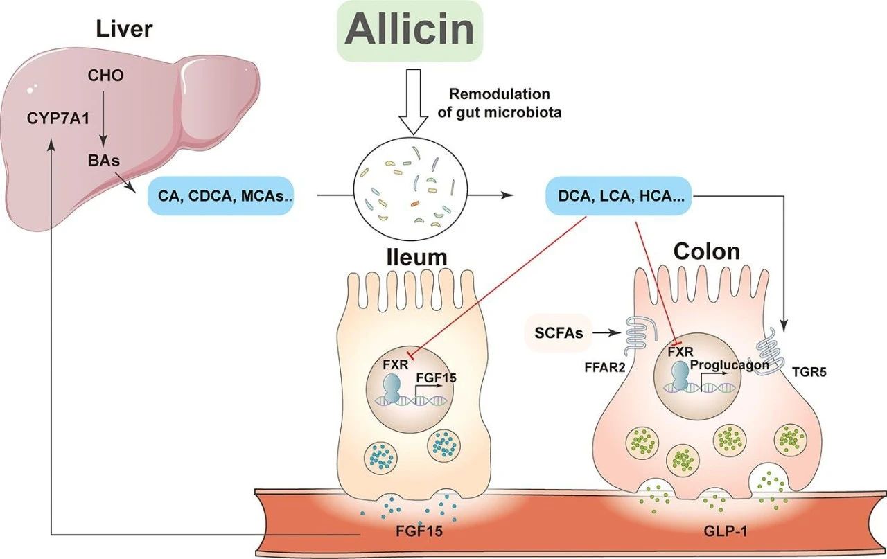 实验结果表明,大蒜素改善了糖尿病大鼠的葡萄糖和脂质代谢,重塑了糖尿病大鼠肠道菌群的组成,并增加了次生胆汁酸和短链脂肪酸的产生。一方面,它通过增加GLP-1分泌来改善葡萄糖和脂质稳态;另一方面,通过抑制肠肝FXR-FGF15-CYP7A1信号传导,胆汁酸的合成增加,从而降低胆固醇水平和肝脏中的脂肪沉积。