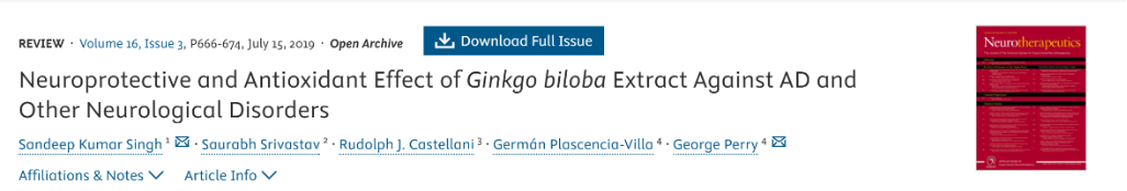 [3] Sandeep Kumar Singh,Saurabh Srivastav,et al. Neuroprotective and Antioxidant Effect of Ginkgo biloba Extract Against AD and Other Neurological Disorders. Neurotherapeutics. https://doi.org/10.1007/s13311-019-00767-8