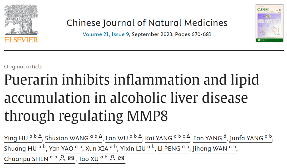 [3] Ying HU,Shuxian WANG,et al. Puerarin inhibits inflammation and lipid accumulation in alcoholic liver disease through regulating MMP8. Chinese Journal of Natural Medicines. https://doi.org/10.1016/S1875-5364(23)60399-1