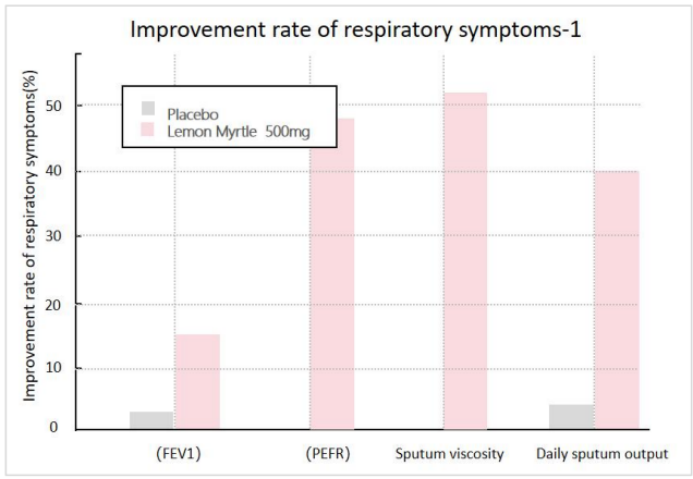 此外,与传统的支气管扩张剂和祛痰制剂相比时,LEMOPONE®柠檬香桃叶超微粉显示出相当的优势且没有明显副作用。在阳性对照组(n=40)中,某支气管扩张剂使FEV1改善了18.2%,但与其相关的是心率增加了13.7%,并且26.5%的受试者报告了心悸、震颤和头晕等副作用。