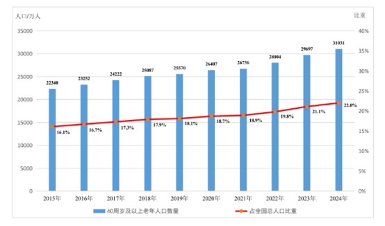 图:2015—2024年全国60周岁及以上老年人口数量及占全国总人口比重