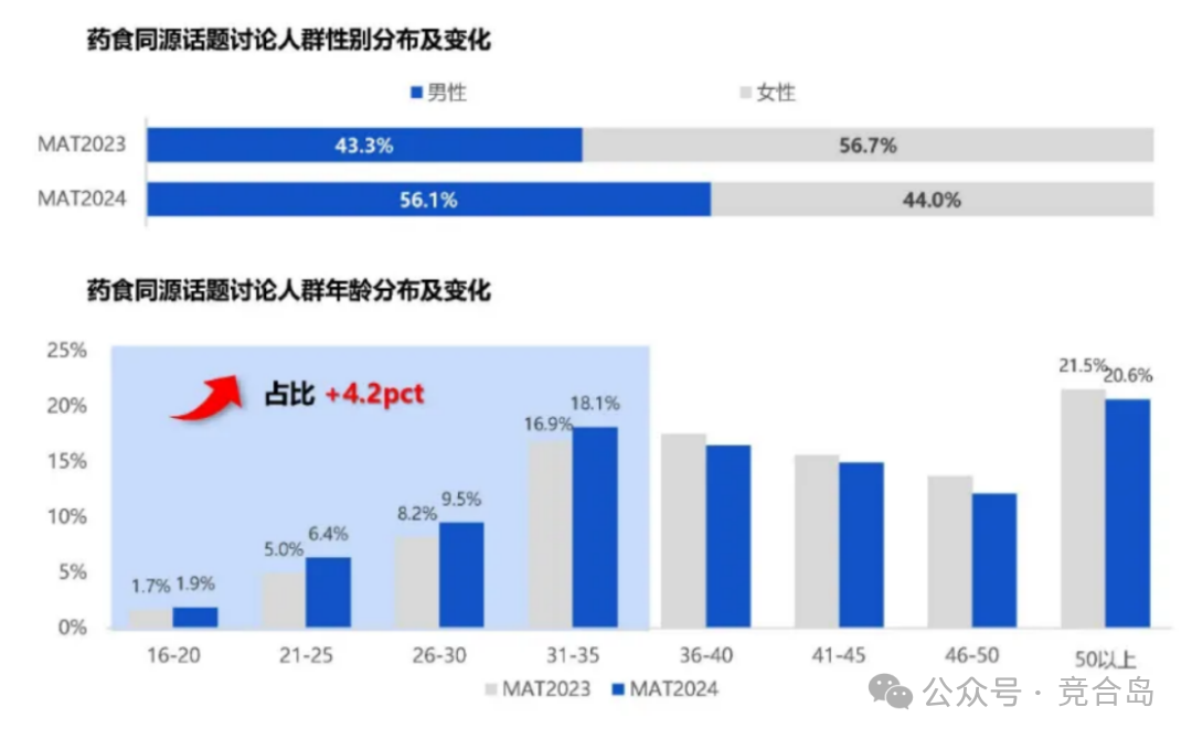·消费端:需求全面升级,市场潜力持续释放。消费端的变化更为明显。《中国健康生活趋势洞察报告》显示,当下消费者的营养健康需求更加细分与专业,传统中式养生成为年轻人的新兴养生方式。其中,药食同源的养生新理念备受年轻人青睐。《2024年药食同源趋势洞察》显示,药食同源成为消费者关注的焦点。其中,男性以高达56.1%的占比占据主导地位;年轻群体也逐渐成为消费主力,35岁以下的年龄段增加了4.2个百分点,无疑显示出药食同源已经成为跨越年龄和性别的广泛关注点。