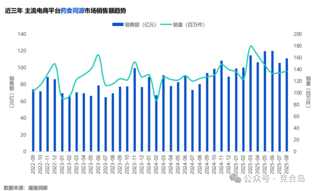 在政策支持与消费升级的双重驱动下,药食同源市场迎来高速发展。2025中国特种食品产业大会公布的数据显示,我国药食同源市场规模已突破3700亿元,全产业链估值超过2万亿元,短短两年增速逼近50%。线上渠道同样火热,魔镜洞察发布的药食同源市场趋势报告显示,近三年药食同源市场销售规模呈波动上升态势,消费者养身需求强烈,消费热度不断提升。MAT2025期间,主流电商平台市场销售额规模达1266.3亿元,同比增长28.9%。