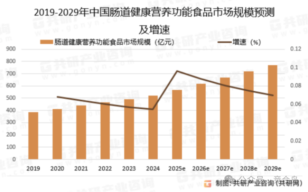 聚焦中国市场,肠道健康功能食品领域呈现出稳步扩容的发展特征,成为全球市场增长的重要驱动力。根据共研产业咨询数据,2024年中国肠道健康营养功能食品市场规模已达519.1亿元,伴随消费者健康意识的提升与产品创新的加速,预计到2029年这一规模将进一步攀升至768.9亿元。