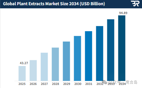 据Business Research Insights数据显示2025年全球植物提取物市场规模为432.7亿美元,预计2026年将增至472.2亿美元,预计到2034年将达到948.9亿美元,2025-2034年期间复合年增长率约为9.12%,有着广阔的增长空间。