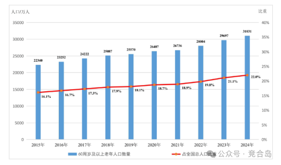 图:2015—2024年全国60周岁及以上老年人口数量及占全国总人口比重