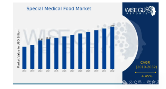 Wise Guy Reports发布的市场分析图表,描绘了全球特殊医学用途配方食品行业从2018年至2032年的稳健增长轨迹。图表数据显示,该市场正处于持续扩张期,2023年的市场规模约为134.5亿美元,2024年已增长至140.5亿美元。根据预测,这一增长势头将长期保持,预计到2032年,全球市场规模将达到约199亿美元。