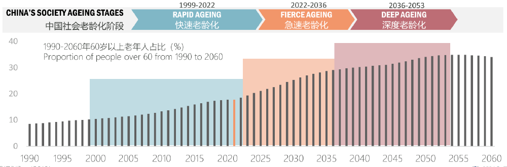人口老龄化已成为当今时代鲜明的全球趋势之一。根据民政部、全国老龄办发布《2022年度国家老龄事业发展公报》相关数据显示,截止到2022年,我国老年人口总数已达2.8亿。据测算,预计“十四五”时期,60岁及以上老年人口总量将突破3亿,总人口占比将超过20%,我国进入中度老龄化阶段。而到2035年左右,我国60岁及以上老年人口将突破4亿,总人口占比将超过30%,进入重度老龄化阶段。