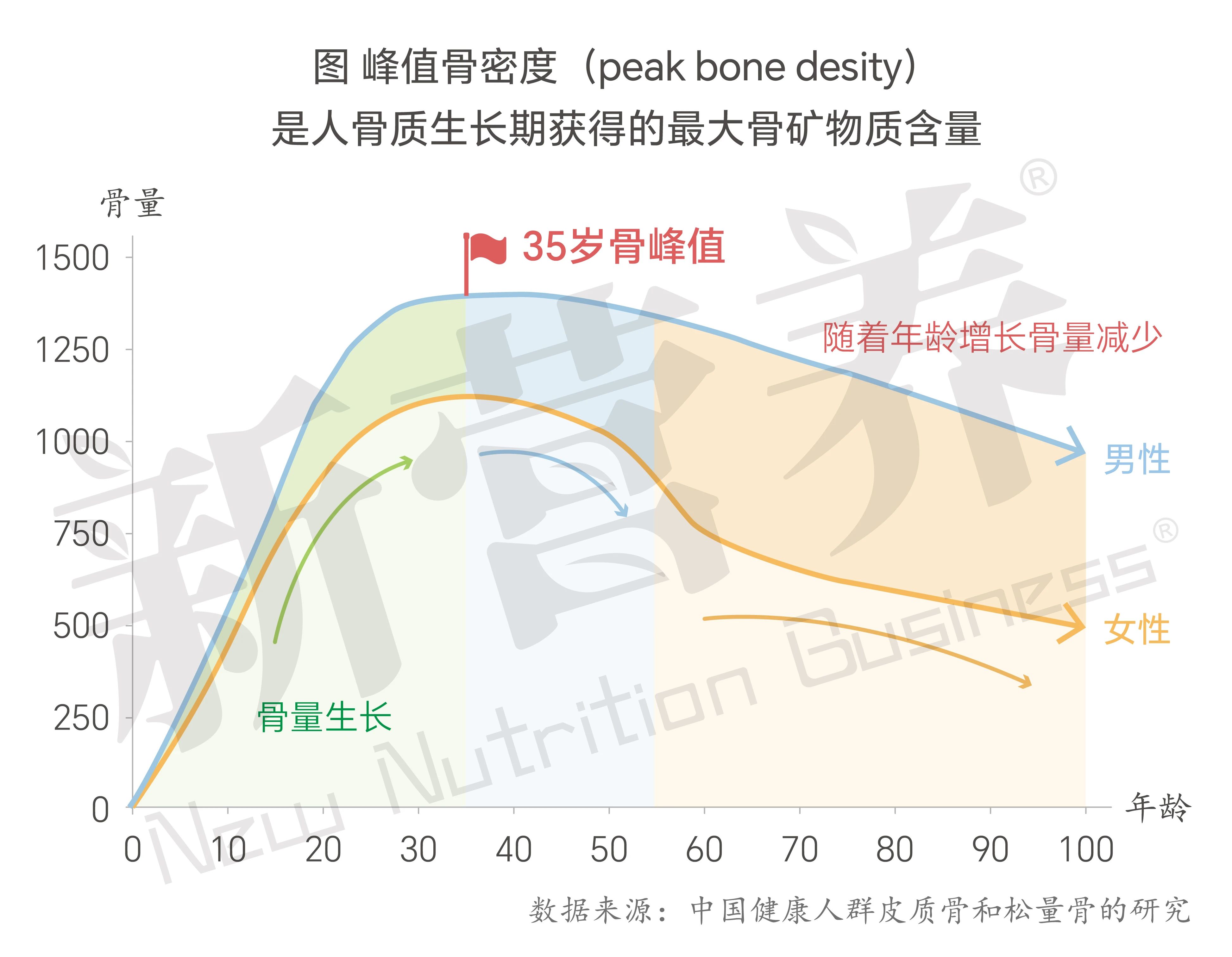 20岁以前主要是骨生长阶段,此后10年骨质继续增加,直至35-40岁左右单位体积内的骨质达到顶峰,接着开始逐渐下降[1]。年轻时钙摄入充足,底子打得牢,流失得就会越缓慢,老年出现骨骼健康问题的概率也会越低。