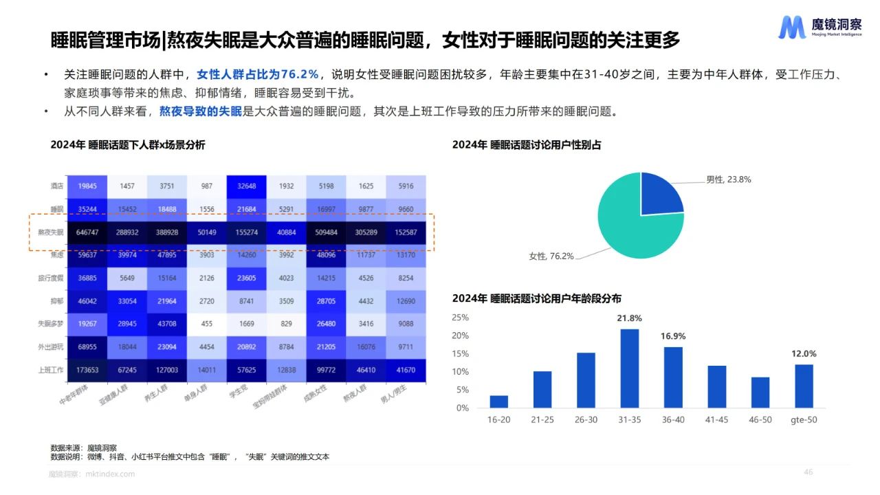 2024年睡眠管理保健食品规模达28.3亿元,同比增长55.8%。高认知成分为Gaba、褪黑素和酸枣仁,刺五加、灵芝、五味子等药食同源成分出现增长。“睡眠+降血脂”、“睡眠+抗衰”、”睡眠+减脂“等复合功效产品崛起。从社媒参与睡眠话题的人群来看,女性人群占比76.2%,年龄集中在31-40岁之间,熬夜导致的失眠是大众普遍的睡眠问题,其次是工作所带来的加班、压力等。