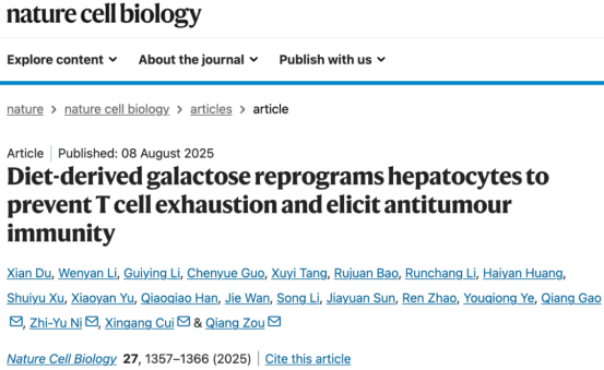 最近,复旦大学、上海交通大学等多中心团队联合在Nature Cell Biology发表了一项重磅研究——首次系统揭示牛奶等饮食中的半乳糖如何通过“肝脏–T细胞”的秘密对话,重塑肿瘤微环境,阻止免疫细胞过早“精疲力尽”,从而显著抑制肿瘤生长。这项研究揭示,日常饮食中的成分,远不止是能量与物质的供给,更是身体内部信息网络的调节者。