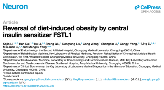 2025 年 10 月 21 日,重庆医科大学杨梦柳副研究员、李伶教授、杨刚毅教授及陆军军医大学第一附属医院(西南医院)李旻典教授等,在Cell 子刊Neuron上发表了题为:Reversal of diet-induced obesity by central insulin sensitizer FSTL1的研究论文。