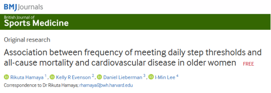 2025年10月21日,哈佛大学附属布莱根妇女医院在《英国运动医学杂志》上发表了一篇题为" Association between frequency of meeting daily step thresholds and all-cause mortality and cardiovascular disease in older women "的研究论文。研究显示,不在于每天走,而在于总数,对于老年女性而言,即使是每周只有1-2天走够4000步,也能显著降低死亡和心血管疾病风险。