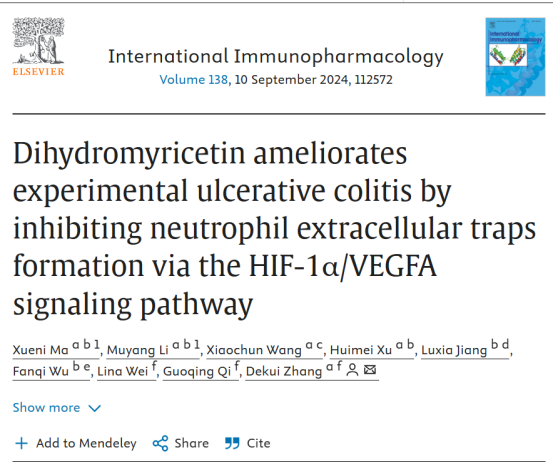 来自Lanzhou University Second Hospital及相关机构的学者在International Immunopharmacology发表的题为“Dihydromyricetin ameliorates experimental ulcerative colitis by inhibiting neutrophil extracellular traps formation via the HIF-1α/VEGFA signaling pathway”的论文。该研究首次明确了二氢杨梅素通过调控NETs生成而缓解UC的机制,为天然产物在炎症性肠病中的应用提供了新证据。不仅丰富了对DHM药理作用的认识,也为UC提供了潜在的天然药物干预策略,DHM有望成为现有药物之外更安全有效的补充或替代方案,对改善患者长期预后具有重要意义。