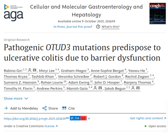 最近,Cell Mol Gastroenterol Hepatol上的一项研究Pathogenic OTUD3 mutations predispose to ulcerative colitis due to barrier dysfunction第一次把矛头指向OTUD3基因,揭开了它和溃疡性结肠炎之间的秘密。OTUD3的缺陷先破坏肠道屏障,然后引发炎症,最后导致结肠炎的病发。