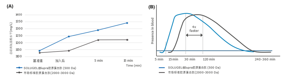 SOLUGEL® Supra的核心优势在于其惊人的吸收速度。独特的小分子SOLUGEL®技术,使其能快速穿越肠道屏障,直达血液。研究显示:其胶原蛋白氨基酸在5分钟内即可被人体肠道细胞(Caco-2)高效吸收,与标准胶原蛋白肽补充剂相比,SOLUGEL® Supra在短时间内吸收更快(Fig.1.A)。在另一项人体临床研究的实证中:SOLUGEL® Supra进入血液的速度更快,血液中氨基酸在30分钟后达到最高水平,比标准胶原蛋白肽快4倍,且在血液循环中停留长达4-6小时( Fig.1.B),为细胞提供快速且持久的补充滋养。