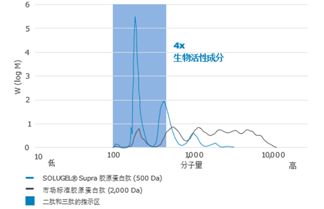SOLUGEL® Supra不仅吸收快,其中蕴含的45%胶原氨基酸、二肽与三肽(生物活性肽)(Fig.2),更是产品高效能的“动力核心”。高含量的胶原二肽和三肽,能快速作用于细胞,介导合成代谢通路,有效促进人体自身胶原蛋白的生物合成,从根源支持肌肤弹性和健康。