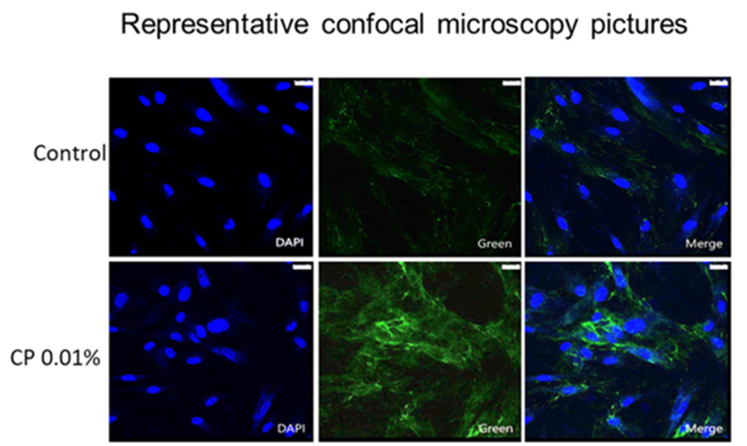 Fig 3: 胶原蛋白的共聚焦显微镜成像。代表性共聚焦显微镜图像(比例尺= 25 μm)显示,真皮成纤维细胞(蓝色)和胶原纤维(绿色)。