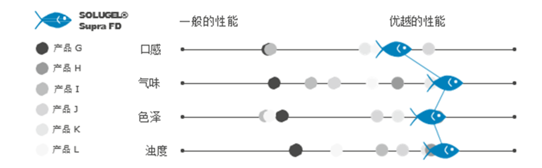 除了卓越的功效表现,SOLUGEL®还拥有优异的感官特性:它溶解迅速且彻底,溶液呈现接近水的无色透明状态,风味极其纯净中性。在专业感官评测中,SOLUGEL®在口感、气味、色泽及浊度上均表现优异,极大拓宽了在各类食品、饮料及营养补充剂中的应用场景,确保最终产品拥有绝佳体验。