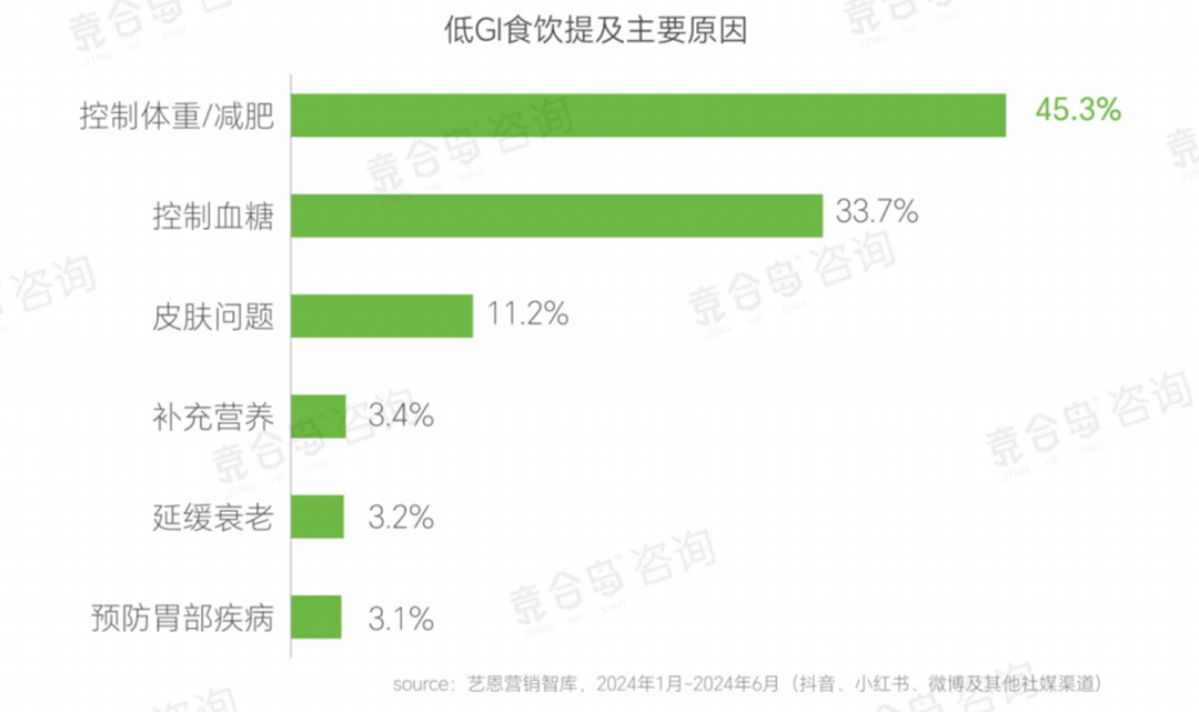 从市场数据来看,低GI食品的增长势头极为迅猛。QY Research发布的报告显示,2024年我国低GI食品市场规模已高达1762亿元,且年增速保持在10%以上。据艺恩营销智库数据,2024年低GI相关内容在社交媒体上的作品量同比增长146%,互动量同比增长200%。在抖音上,#低gi话题超3.6亿次播放;小红书上低GI饮食总浏览量破千万。消费者偏好的变化也带动了行业的转变,从需求来看,控制体重/减肥(45.3%)、控制血糖(33.7%)、皮肤问题(11.2%)是消费者选择低GI食品背后的主要动机。