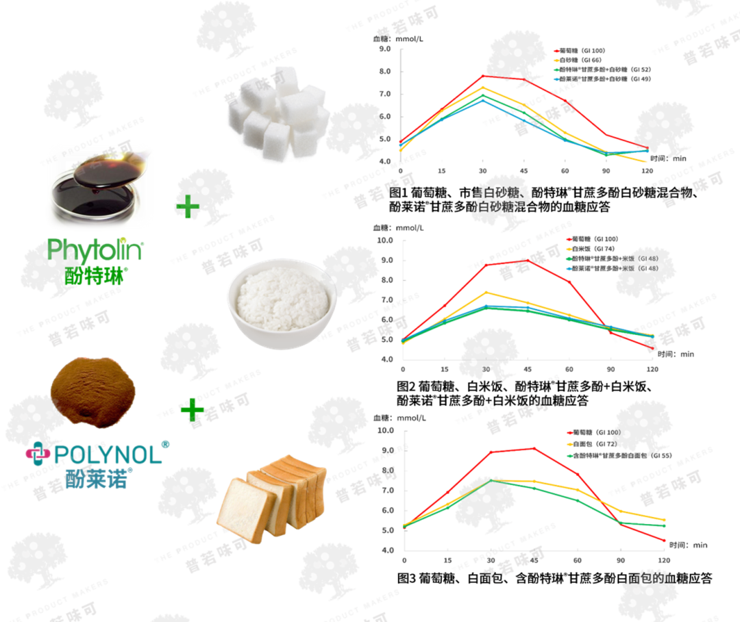 这种全链路“控糖”机制,区别于单一靶点的控糖成分,让低GI效果更稳定、更持久。值得一提的是,TPM普若味可甘蔗多酚的“控糖”效果经过了严格的科学验证。人体实验数据显示,受试者服用添加1.38%酚特琳®甘蔗多酚的白砂糖混合物,GI值从66降至52;针对添加0.18%的酚莱诺®甘蔗多酚的白砂糖混合物,受试者食用后GI值降至49,证实甘蔗多酚可通过影响白砂糖GI值,使白砂糖变身成为低血糖生成指数的白砂糖,即提供“慢糖”优质碳水。
