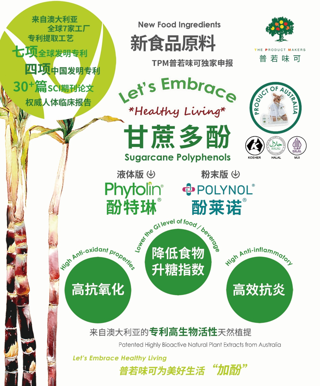 TPM普若味可甘蔗多酚甄选自澳大利亚专属甘蔗种植带,日照长、昼夜温差大、土壤富含矿物质,配合高湿度气候,孕育出天然高多酚、强抗逆性的甘蔗品种,种植全程不打农药、杀虫剂。再叠加TPM普若味可全球专利提取技术,仅以水、乙醇为提取溶剂,全程不使用石油醚、乙酸乙酯、丙酮等有机溶剂。正是这种“天时-地利-人和”的协同,才赋予TPM普若味可甘蔗多酚独特的稳定一致、生物活性卓越的品质基底,为全球低GI产品提供天然健康解决方案。