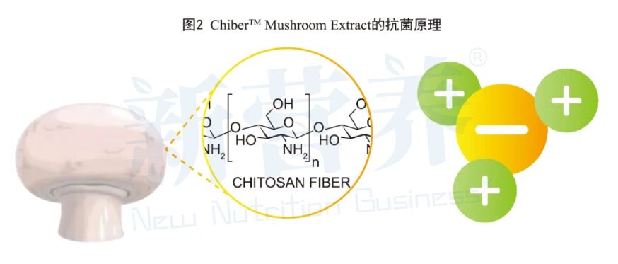 Chiber™ Mushroom Extract主要含有壳聚糖,壳聚糖分子在酸性环境(pH<6.5)中带正电荷,通过静电作用吸附微生物细胞壁的负电荷组分,破坏其膜结构导致内容物泄漏。实验室结果显示,壳聚糖是一种有效的抗菌成分,效果覆盖常见腐败微生物,如大肠杆菌、金黄色葡萄球菌、黑曲霉等。(见图2)