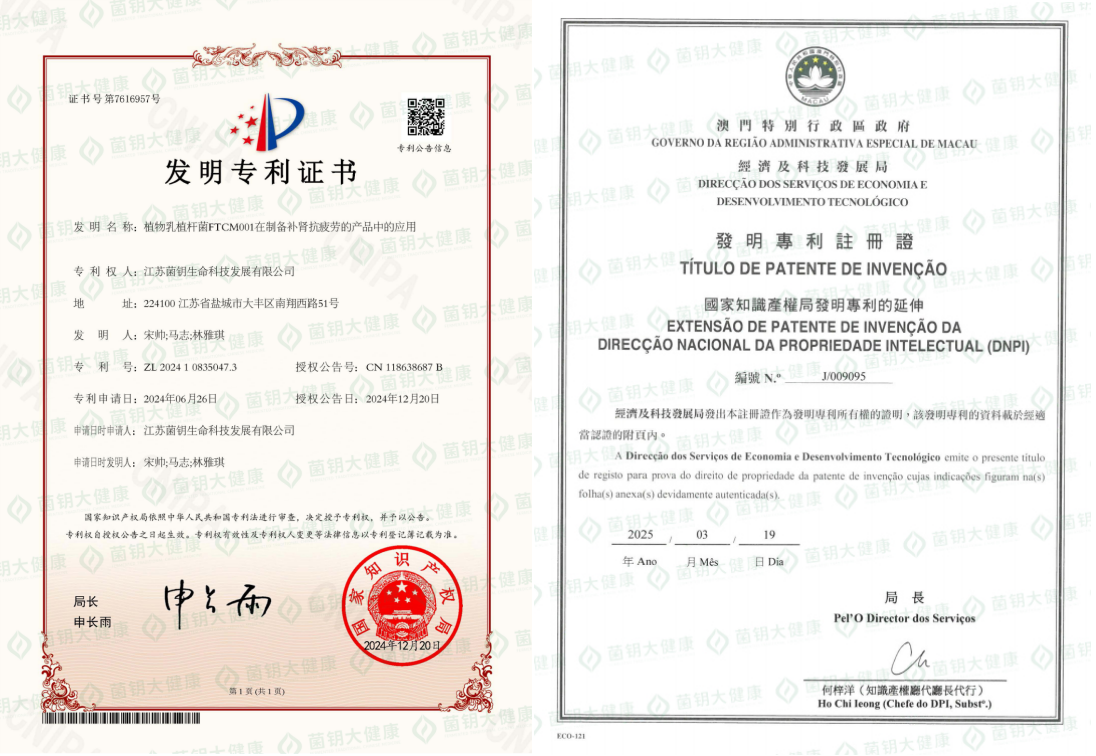 菌钥大健康自主研发的核心菌株FTCM001申请的《植物乳植杆菌FTCM001在制备补肾抗疲劳产品中的应用》是菌株筛选领域的标志性成果。这款专利不仅斩获国内授权,更成功拿下澳门特别行政区专利认证,成为粤港澳大湾区生物科技领域的里程碑式突破。该专利以精准的菌株功能定位与扎实的研发数据,为产品提供权威背书,更按下了菌钥大健康布局大湾区及国际市场的“加速键”,彰显核心菌株技术的国际认可度。