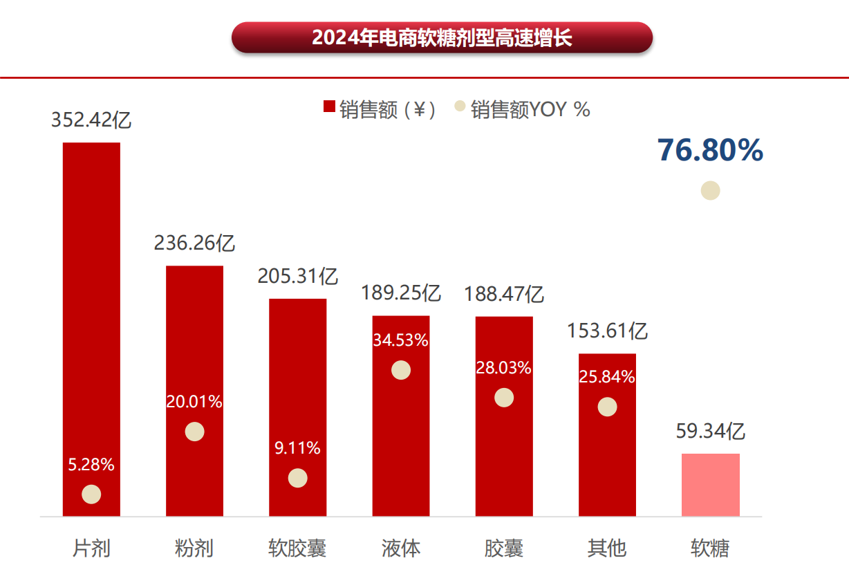 2024年电商平台数据显示,软糖在所有剂型中增长最快,增速超76%[1]。这一爆发式增长的背后是消费者对于“便捷性、趣味性、营养健康”需求的三重驱动。特别是对于儿童群体而言,片剂等传统剂型无论是在口味口感还是外观体验方面,都较容易让孩子产生抵触心理,依从性低,复购率难以保障。而营养软糖不仅口味符合孩子们的需求,好吃好看又兼具趣味性,儿童接受度高,也因此,儿童营养软糖在该品类中保持较快增速。