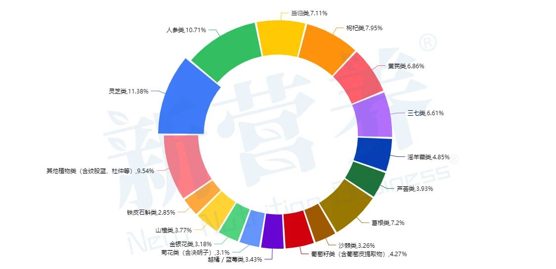 其中,在植物性营养素类别中,灵芝(含灵芝孢子,11.38%)、人参类(10.71%)等传统中药类原料居多;葛根、人参、枸杞等药食同源的中药材也常被添加在保健食品中。