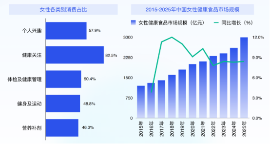 2025年女性健康食品市场规模预计突破3000亿元,年复合增长率保持高位。这一增长源于女性健康意识觉醒与消费能力提升,超7成女性愿为健康食品支付溢价,“自我健康投资”成为消费新逻辑。从消费占比看,健康关注类消费占比达82.5%,远超个人兴趣、营养补剂等类别,反映女性对健康管理的投入优先级显著提升。