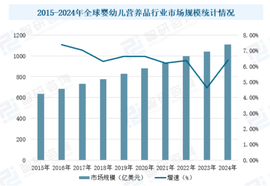 随着全球中产阶级规模的持续扩大和可支配收入的提高,婴幼儿家庭的消费能力显著增强,直接推动了市场对高品质、安全可靠且营养均衡的婴幼儿食品需求的快速增长。数据显示,全球婴幼儿营养品行业市场规模从2015年的634.9亿美元增长至2024年的1108.2亿美元,年复合增长率为6.38%。未来,在消费升级趋势延续、新兴市场渗透率提升以及产品创新持续深化的共同作用下,全球婴幼儿营养品市场有望保持稳定的增长态势。