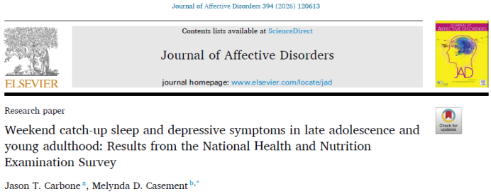 近日,纽约州立大学研究团队在"Journal of Affective Disorders"期刊上发表了一篇题为"Weekend catch-up sleep and depressive symptoms in late adolescence and young adulthood:Results from the National Health and Nutrition Examination Survey"的研究论文。研究显示,周末补觉与青少年和青年抑郁风险降低41%相关,而工作日睡眠不足或过长、睡眠中点时间过早或过晚等显著增加抑郁风险,表明周末补觉可能是一种健康的睡眠习惯,有助于降低抑郁风险。