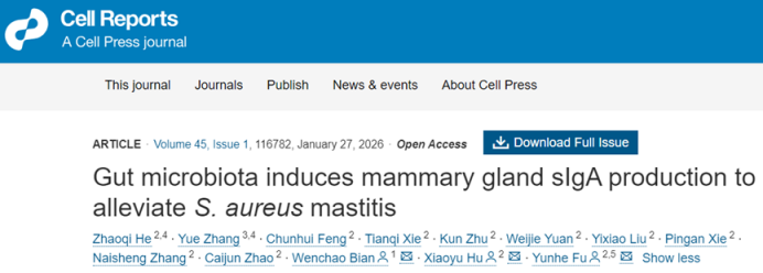 吉林大学付云贺等合作发现缓解金黄色葡萄球菌乳腺炎的潜在新策略