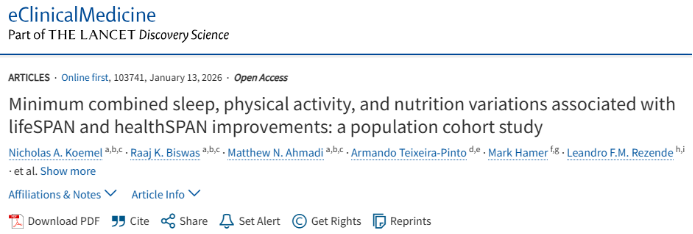 2026年1月13日,悉尼大学研究人员在《柳叶刀》子刊"eClinicalMedicine"上发表了一篇题为" Minimum combined sleep,physical activity,and nutrition variations associated with lifeSPAN and healthSPAN improvements:a population cohort study"的研究论文。研究显示,达到睡眠、运动、饮食最佳组合(每天睡7.2-8小时、中高强度运动超过42分钟、饮食质量得分57.5-72.5),预计可增加9.35年预期寿命和9.45年健康寿命。