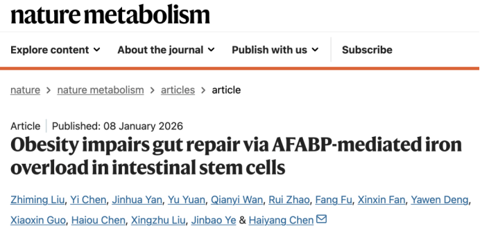 近日,四川大学华西医院陈海洋教授团队在Nature 子刊 Nature Metabolism 上发表了题为:Obesity impairs gut repair via AFABP-mediated iron overload in intestinal stem cells 的研究论文。该研究表明,肥胖会导致 AFABP 蛋白水平升高,而 AFABP 通过与血浆转铁蛋白结合,导致肠道干细胞(ISC)中铁过载,损害肠道干细胞的分化和肠道损伤后的修复。这些研究结果揭示了肥胖与肠道修复之间的机制联系,并确定了脂肪组织-肠道信号轴是肥胖相关肠道疾病的治疗新靶点。