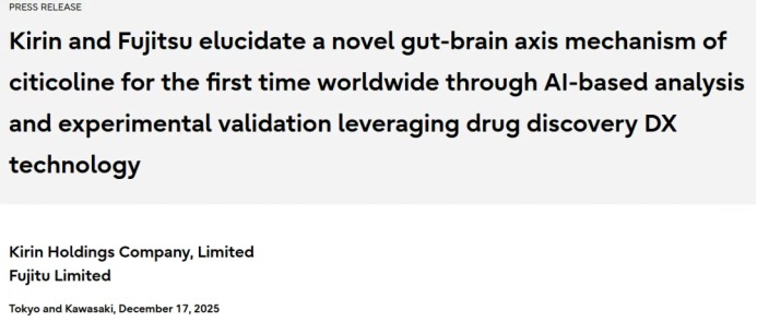 日本麒麟控股有限公司与富士通有限公司联合宣布,双方通过运用创新性的“药物发现DX”技术,结合人工智能深度分析与实验验证,在全球范围内首次成功揭示了胞磷胆碱作用于肠脑轴的全新作用机制。本次研究发现源于麒麟与富士通联合推进的食品功能模拟研究计划,该计划旨在探索并开发食品的新功能属性。研究结果首次在全球范围内揭示了一种此前未知的脑肠轴作用机制,该机制与胞磷胆碱密切相关。