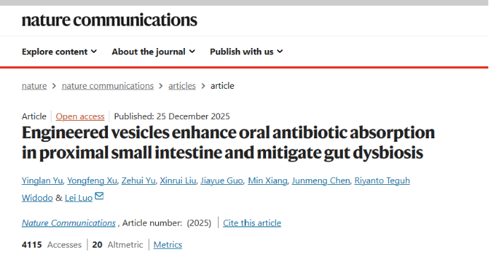 如何让抗生素既精准杀菌,又不伤害肠道?西南大学药学院罗雷团队的最新研究,给出了兼顾疗效与安全的答案。这项发表在Nature Communications的成果,用牛奶外泌体和脂质体打造出“智能递送系统”,让口服抗生素实现“高效吸收+肠道保护”双重目标。